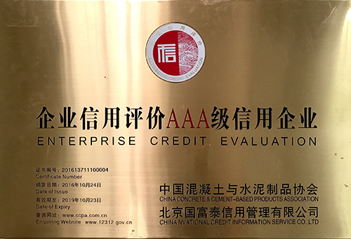 Enterprise Credit Grade AAA Certificate by China concrete and cement products Association |