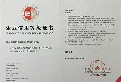 AAA certificate of corporate credit grade issued by China water Conservancy enterprises association |